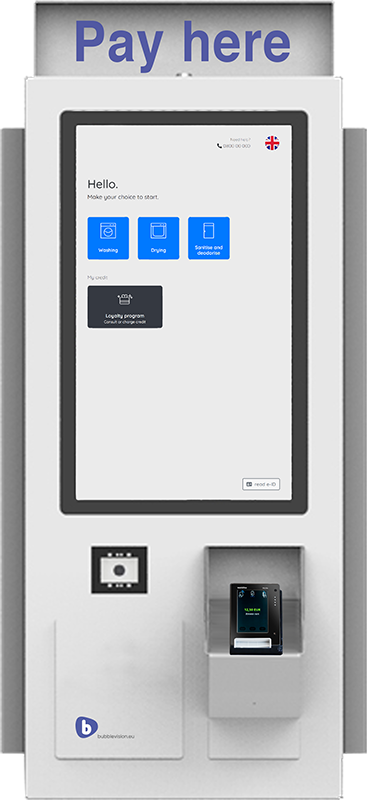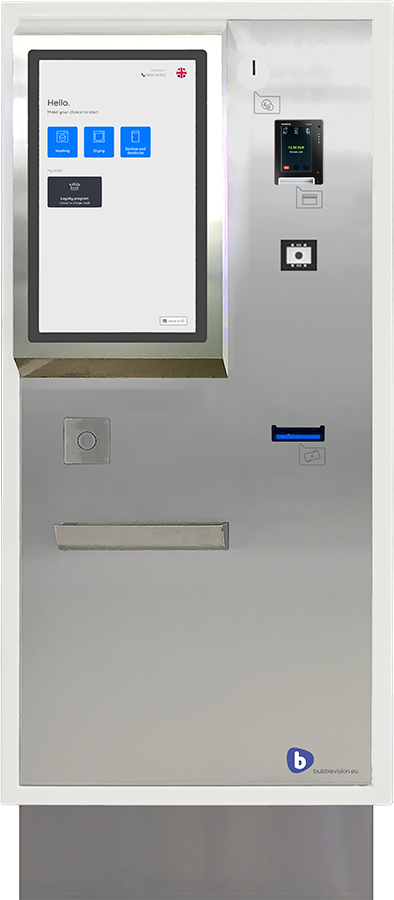 Bij Bubblevision zijn mobiele betalingen standaard inbegrepen. Wil je ook betalingen met betaalkaarten of cash aanvaarden? Maak dan gebruik van onze kiosk, verkrijgbaar in 2 verschillende versies.